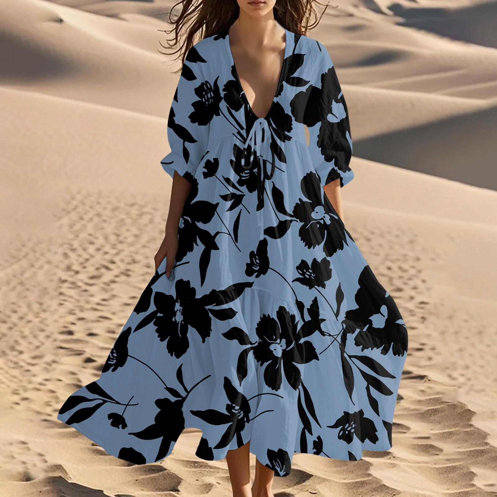 Женское летнее модное платье макси с V-образным вырезом для пляжа, винтажное, с цветочным принтом, шнуровкой и вставками M синий