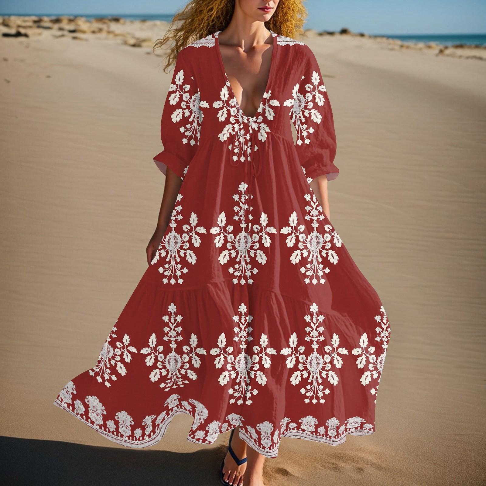 Женское летнее модное платье с V-образным вырезом, ретро цветочным принтом, короткими рукавами, пляжное платье с кружевной отделкой XL винный