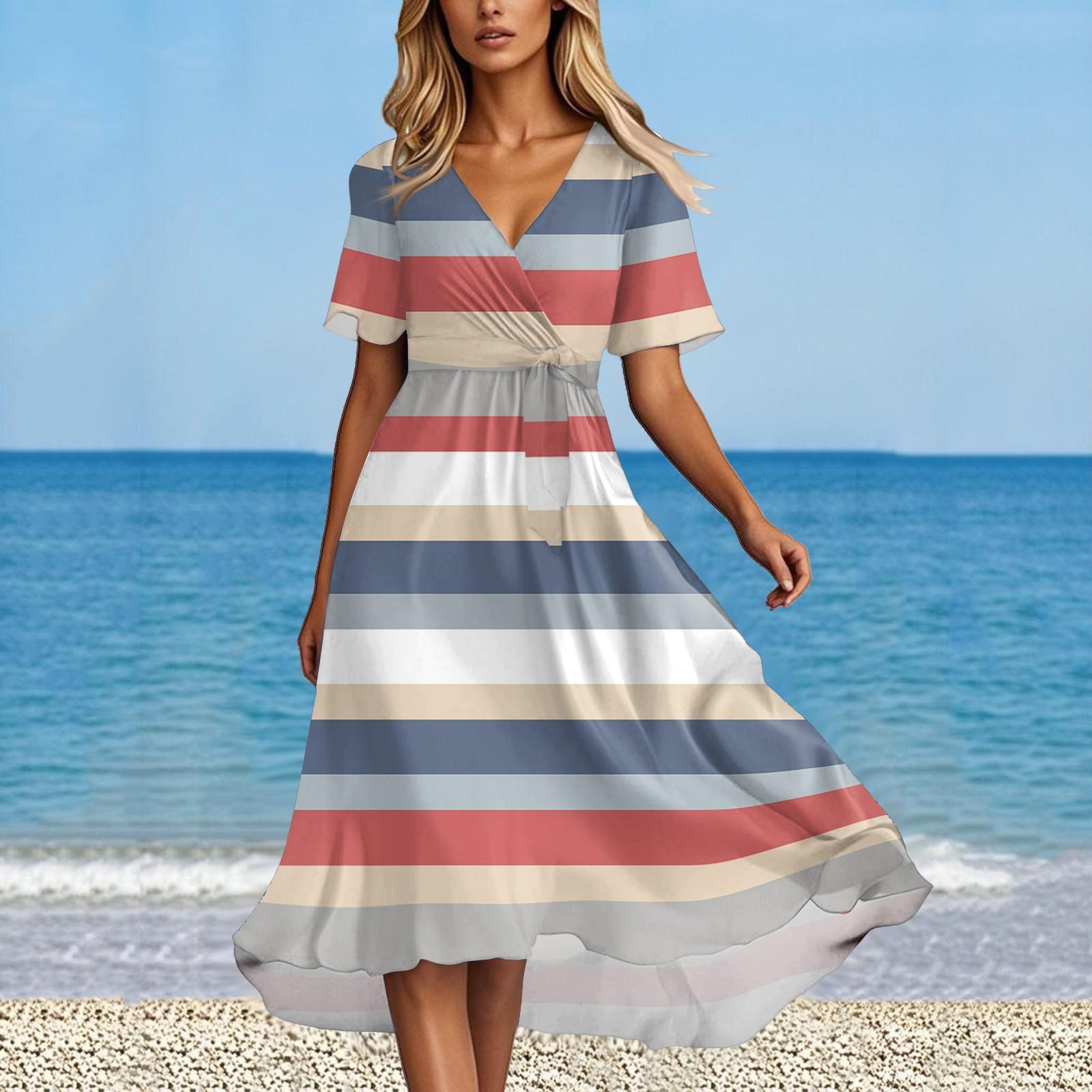 Женское летнее модное расклешенное платье с V-образным вырезом, короткие рукава, полосатые геометрические платья L арбуз красный