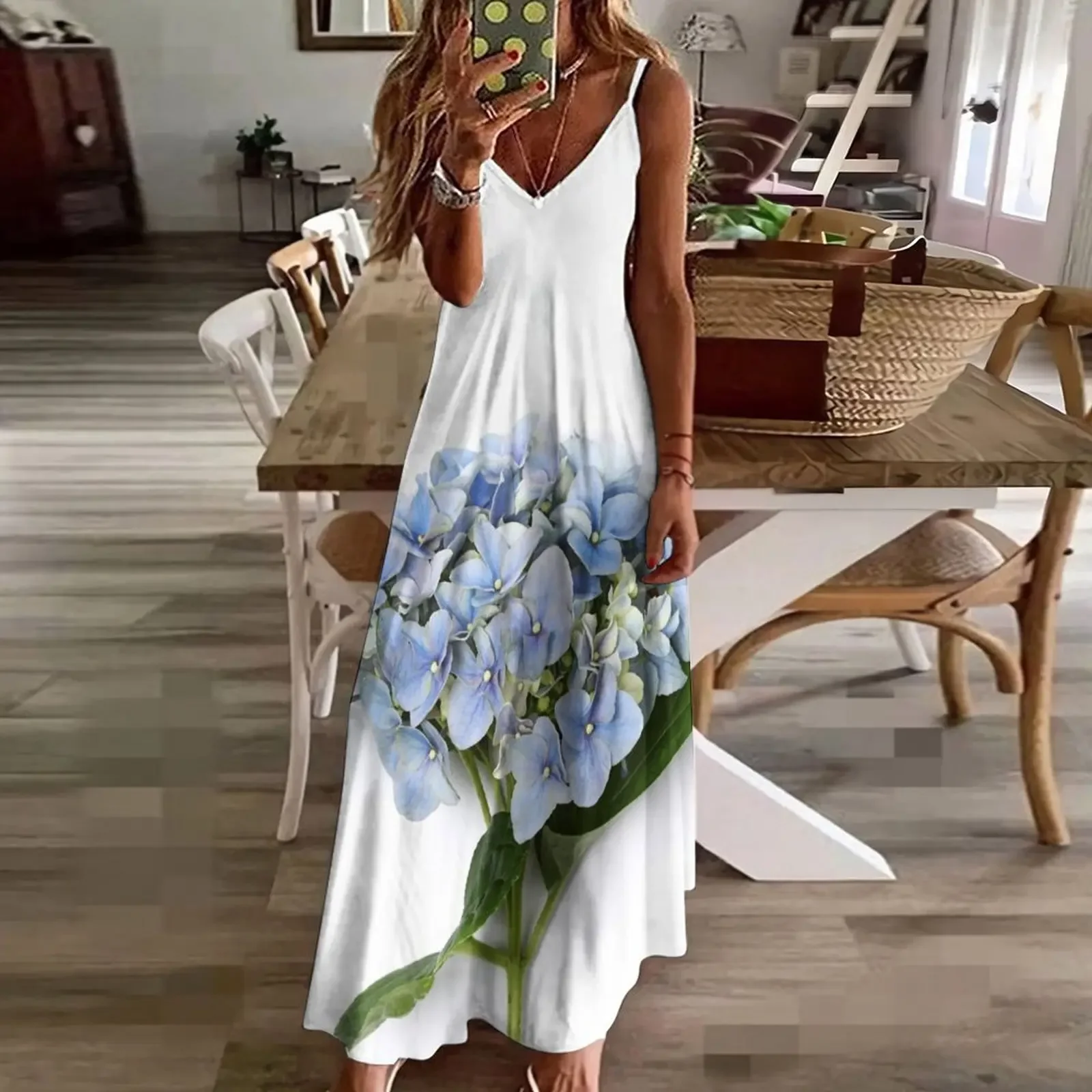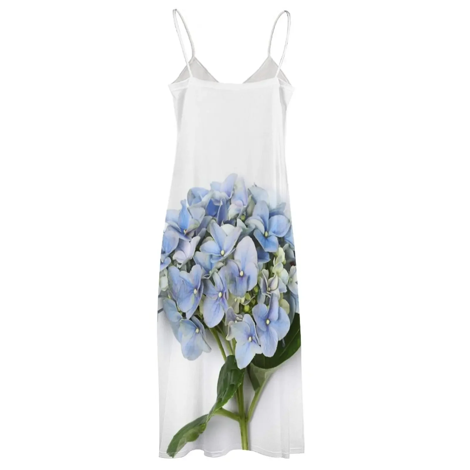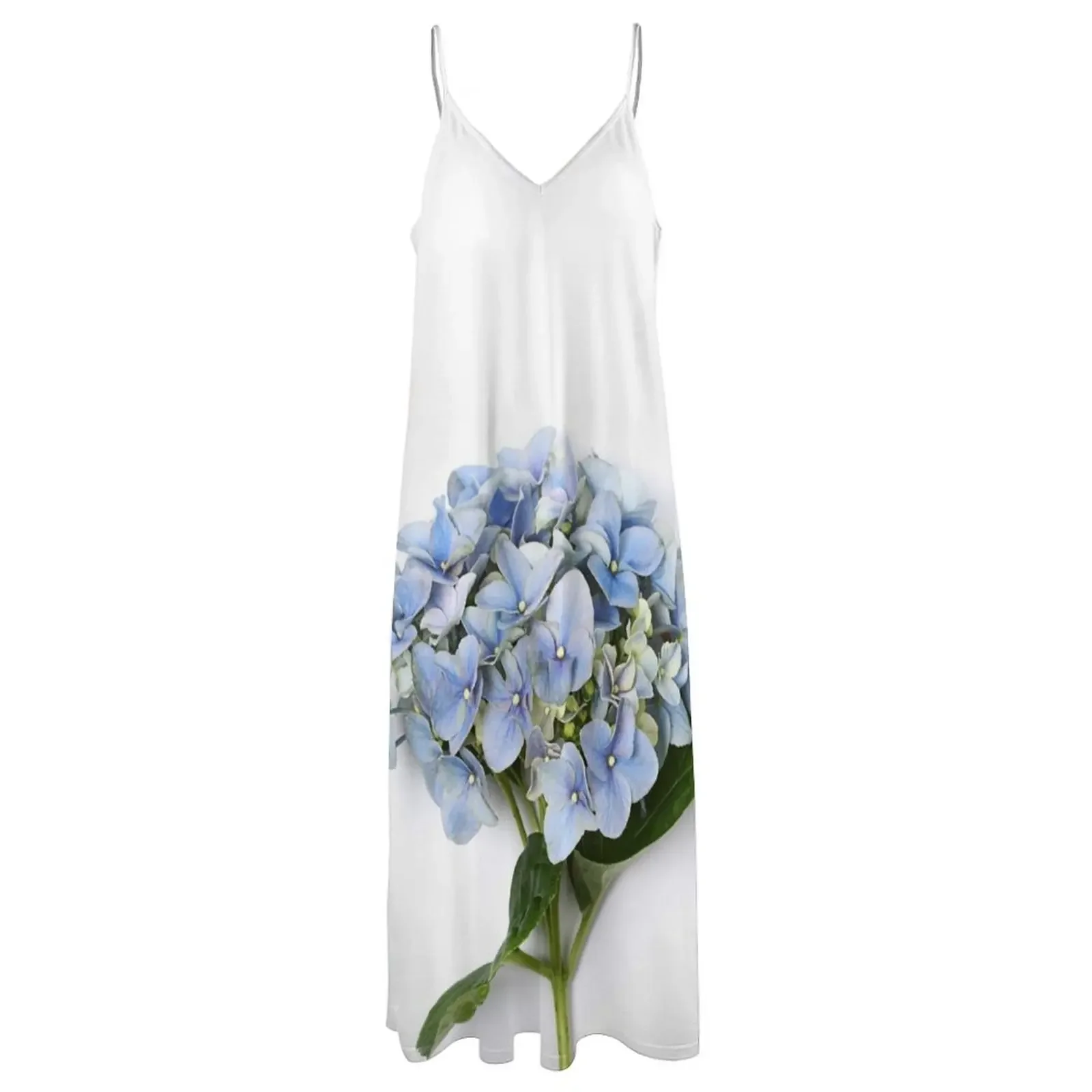 Женское летнее платье без рукавов, голубое платье с цветочным принтом гортензии, лето 2024