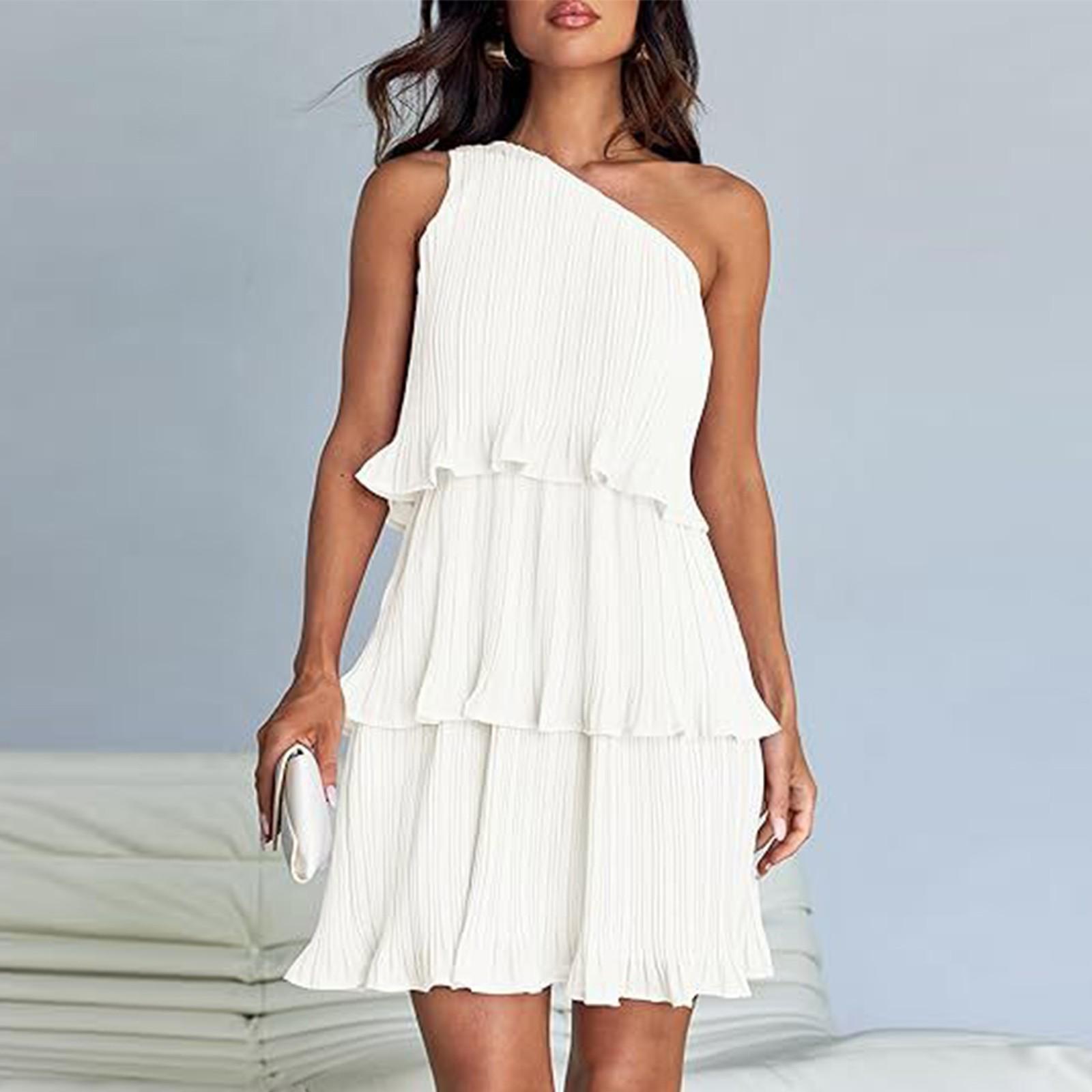 Женское летнее платье без рукавов 2024, бохо на одно плечо с рюшами, многослойные шифоновые струящиеся платья трапециевидной формы XL белый