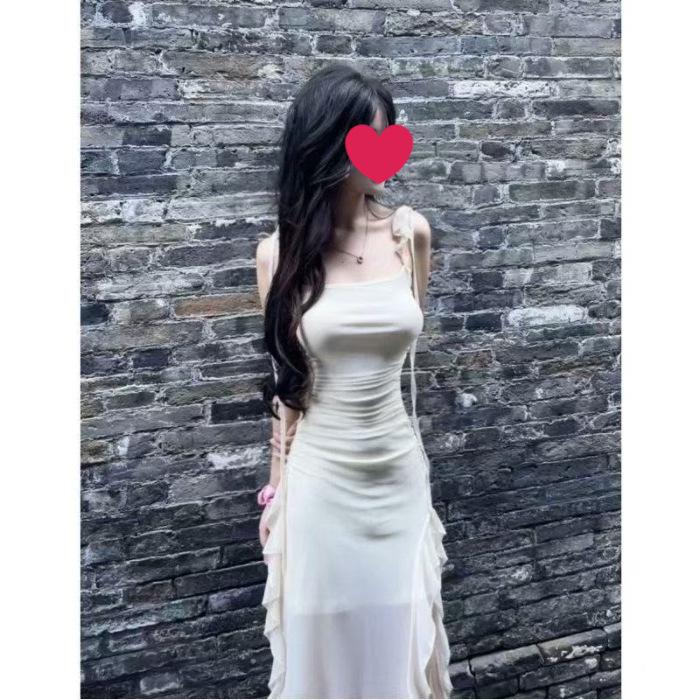 Женское летнее платье в пикантном сладком стиле на бретельках-спагетти – пышный рукав, приталенная талия, сетка, асимметричный подол M бежевый