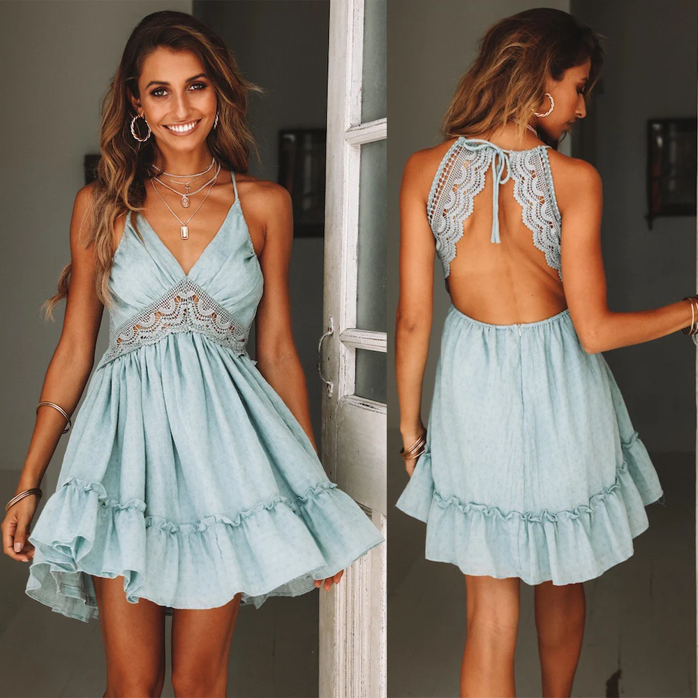 Женское летнее платье на бретелях-спагетти, богемное привлекательное мини-платье с вышивкой и открытой спиной, кружевное пляжное повседнев...