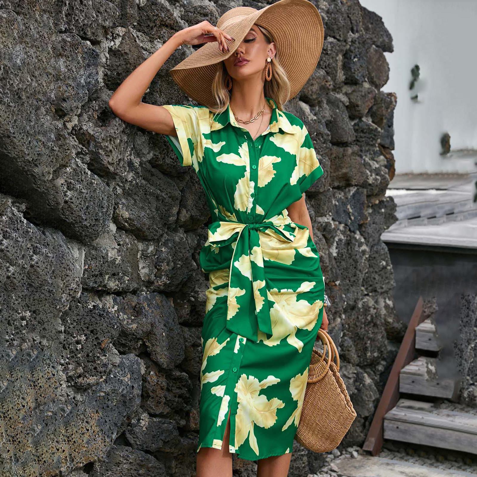 Женское летнее платье с короткими рукавами и высокой талией в этническом стиле на шнуровке L зелёный