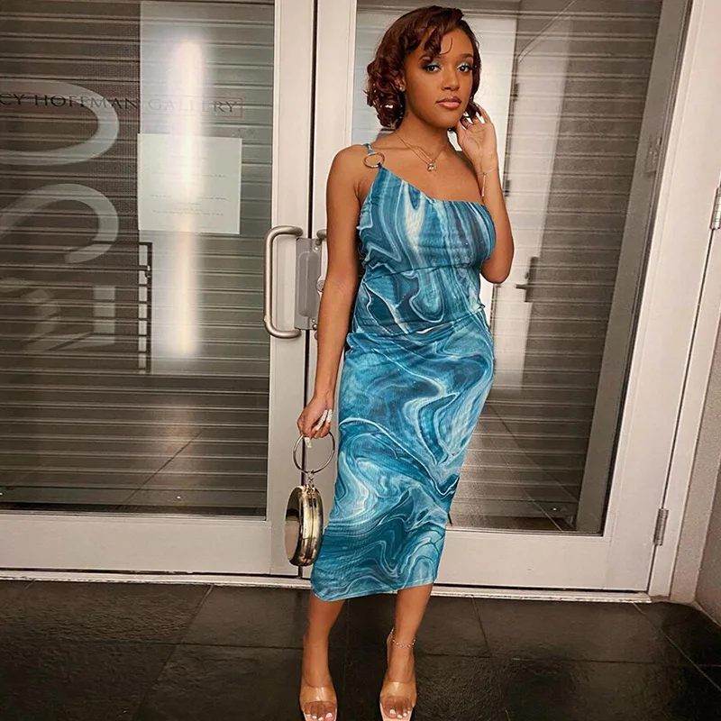 Женское летнее платье с принтом, облегающее пикантное облегающее платье на одно плечо, с о-образным вырезом, на бретелях-спагетти, с принтом