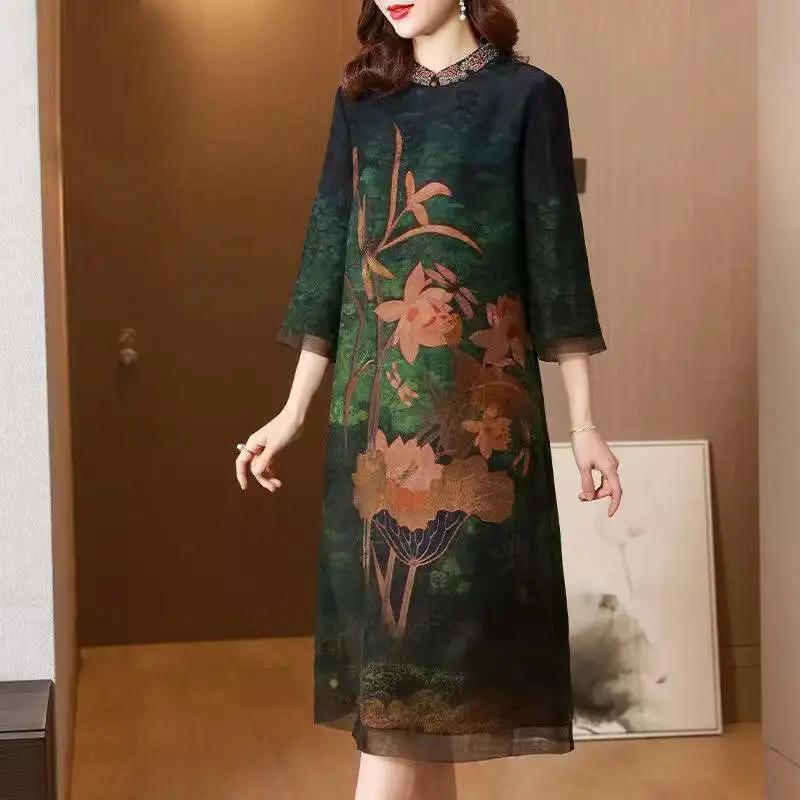 Женское летнее платье-ципао в китайском стиле, элегантная юбка-трапеция с воротником-стойкой для мам, прикрывающая живот 4XL зелёный