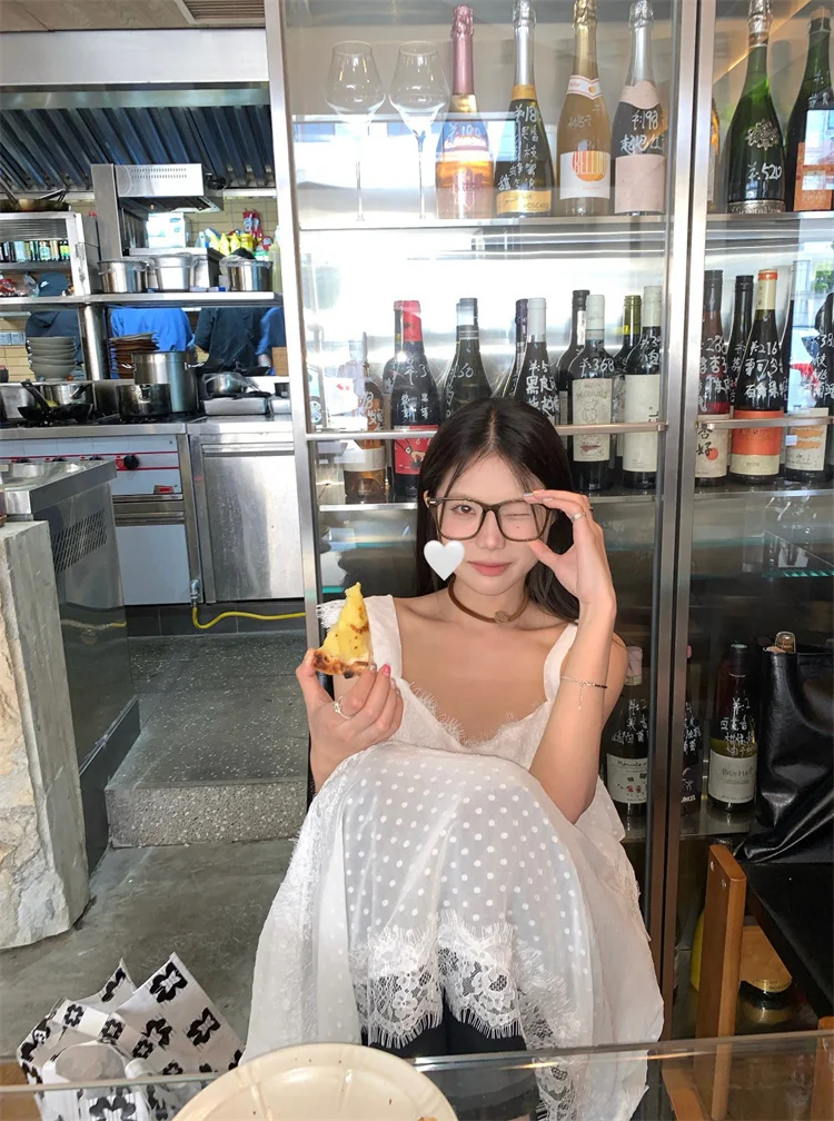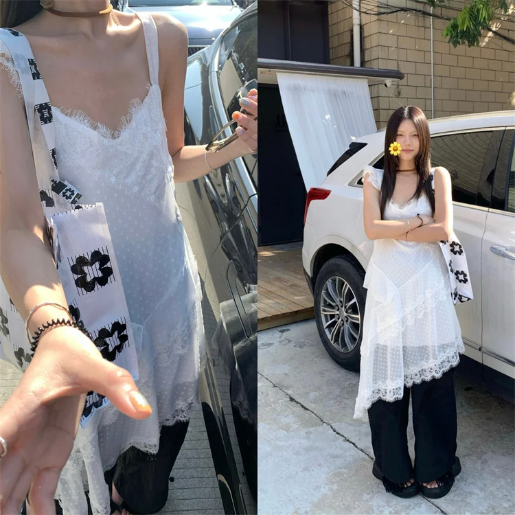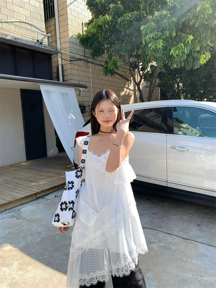 Женское летнее платье Coigarsam 2024, офисные белые кружевные платья в горошек без рукавов с V-образным вырезом