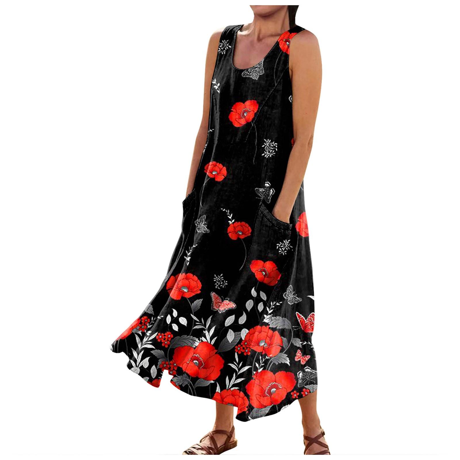 Женское летнее повседневное модное платье без рукавов с карманом и круглым вырезом M чёрный