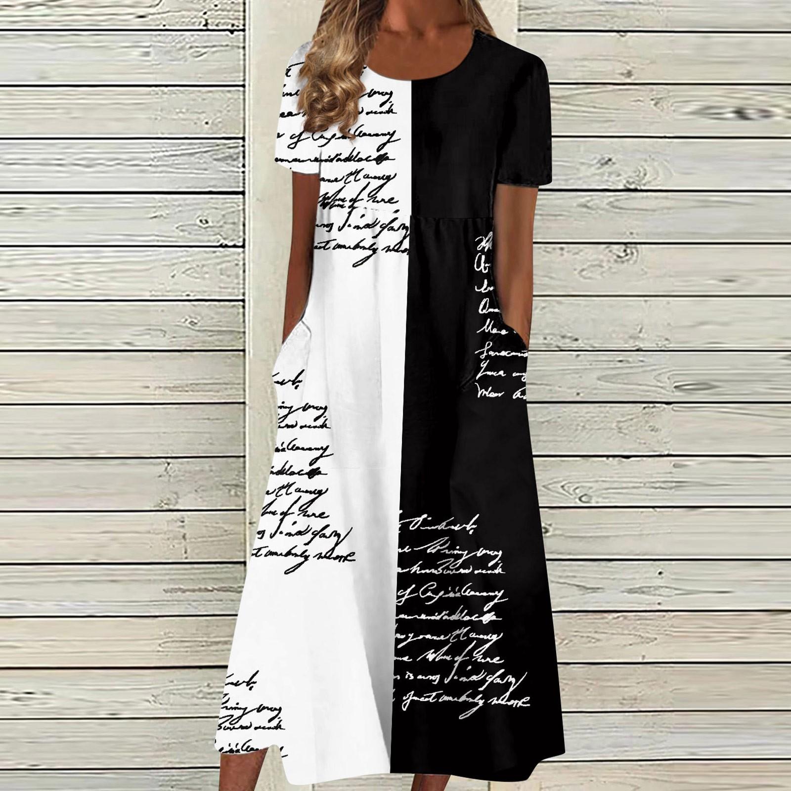 Женское летнее повседневное модное платье с коротким рукавом и карманом с круглым вырезом L чёрный