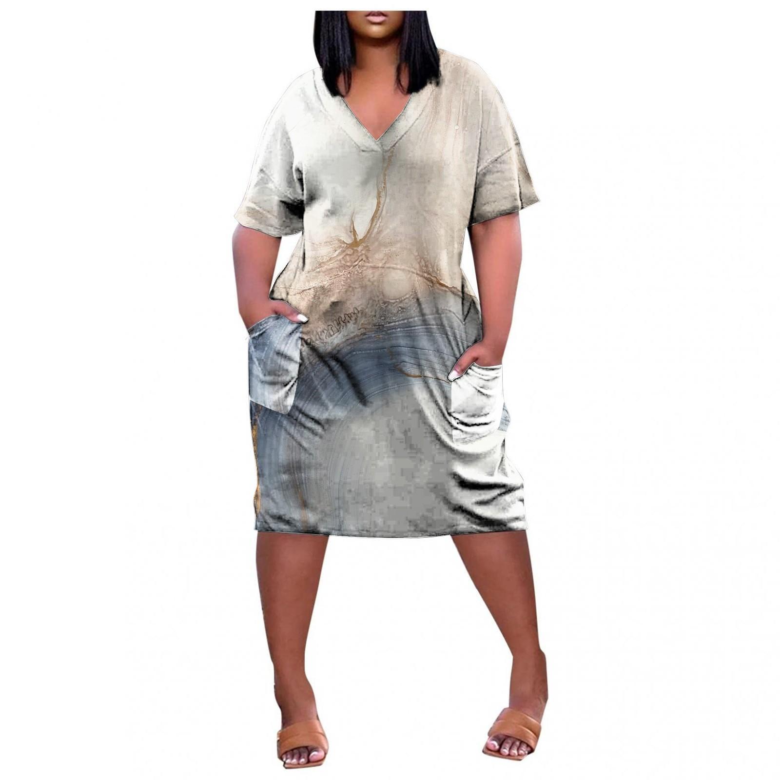 Женское летнее повседневное платье больших размеров с v-образным вырезом и короткими рукавами и карманами до колена с принтом L серый