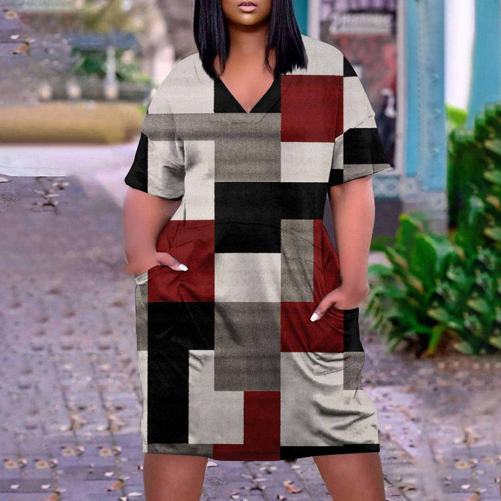 Женское летнее повседневное платье больших размеров с v-образным вырезом и коротким рукавом с карманом до колена S винный