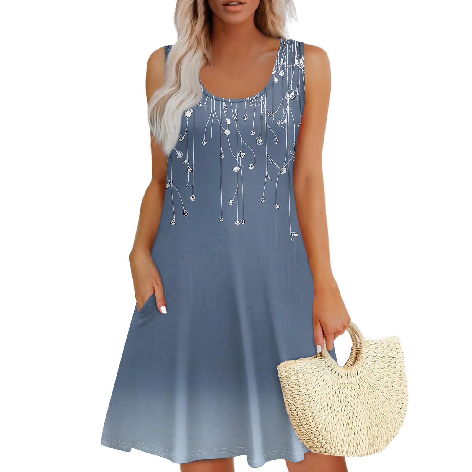 Женское летнее повседневное платье с U-образным вырезом и цветочным принтом, платье без рукавов с карманами S тёмно-синий