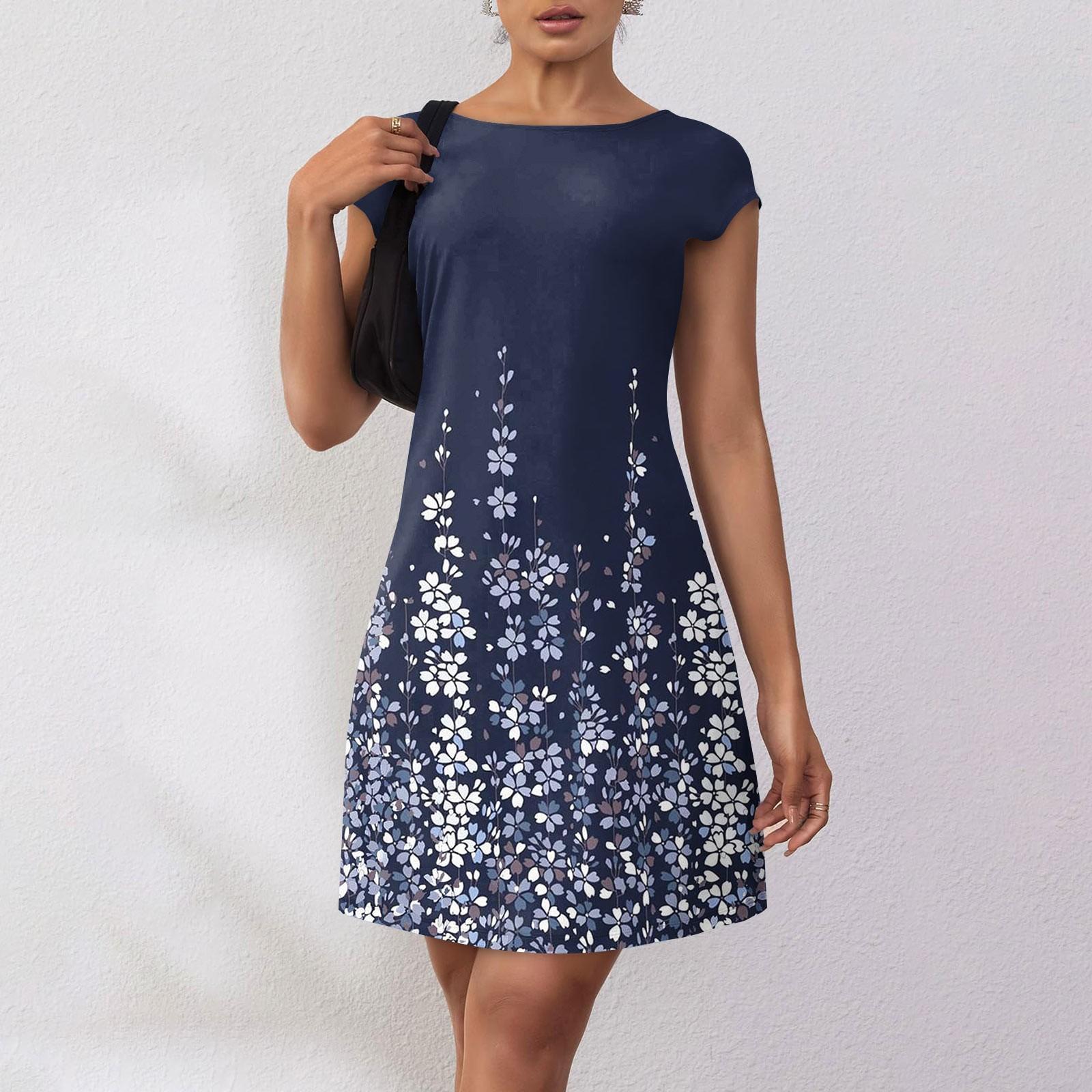 Женское летнее повседневное платье-футболка с открытой спиной и принтом, шляпой и рукавами, вечернее платье с круглым вырезом M тёмно-синий