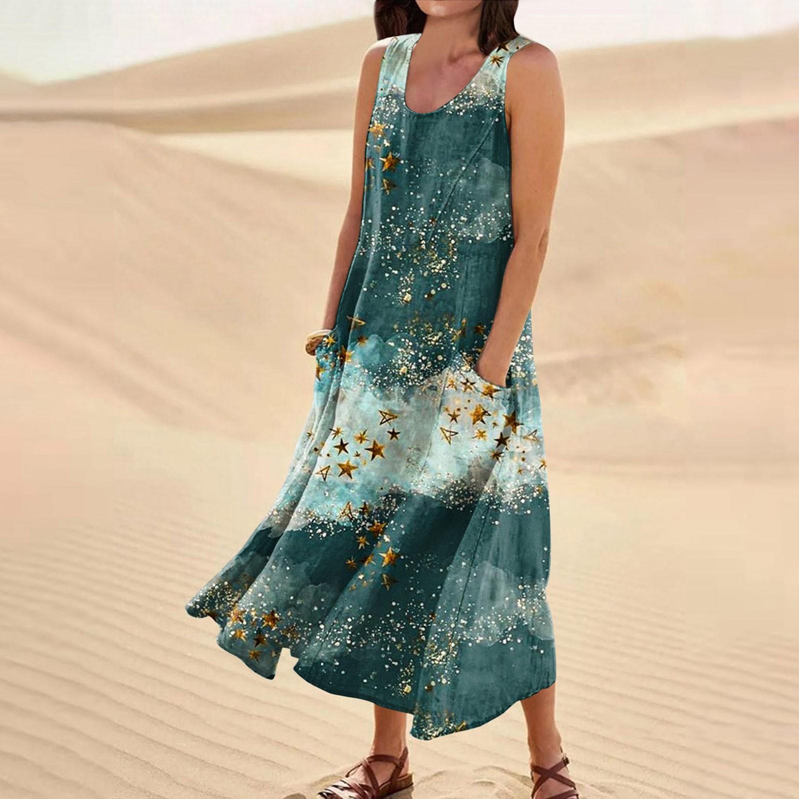 Женское летнее свободное свободное платье без рукавов с круглым вырезом и звездами в стиле пэчворк с цветным принтом и карманом XXXL зелёный