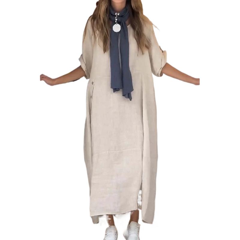 Женское летнее хлопково-льняное платье макси, повседневные свободные платья с короткими рукавами и круглым вырезом с разрезом, неровный подол XXXXXL абрикосовый