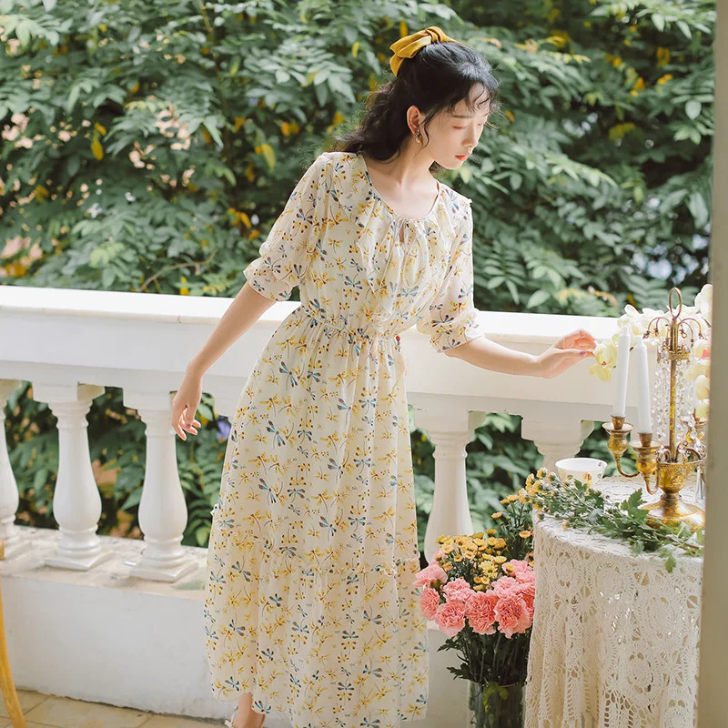 Женское летнее шифоновое платье с цветочным принтом и рукавом-фонариком