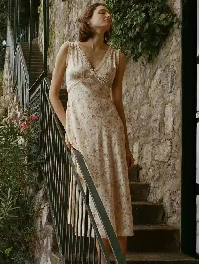 Женское летнее элегантное платье макси без рукавов с V-образным вырезом и принтом во французском стиле