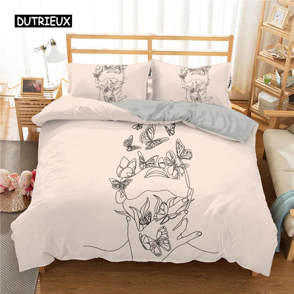 Женское лицо, линии, эскиз, король, королева, пододеяльник, женский портрет, роза, комплект постельного белья, простые штрихи, цветок, полиэстер, одеяло, чехол EU single(135x200cm)