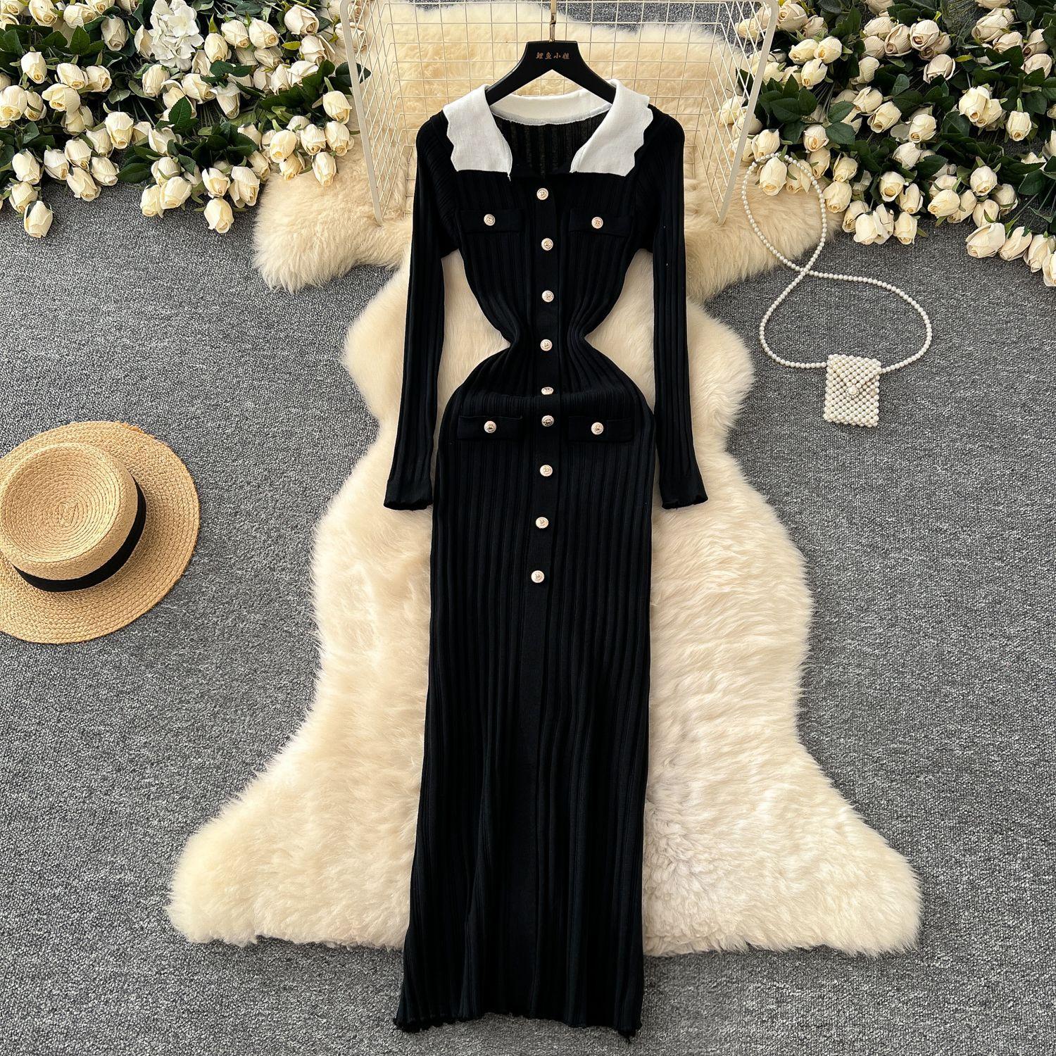 Женское маленькое парфюмерное платье в стиле ретро с отворотом цвета столкновения, длинными рукавами, металлической пряжкой, тонкое, темпераментное, вертикальное трикотажное платье One size чёрный