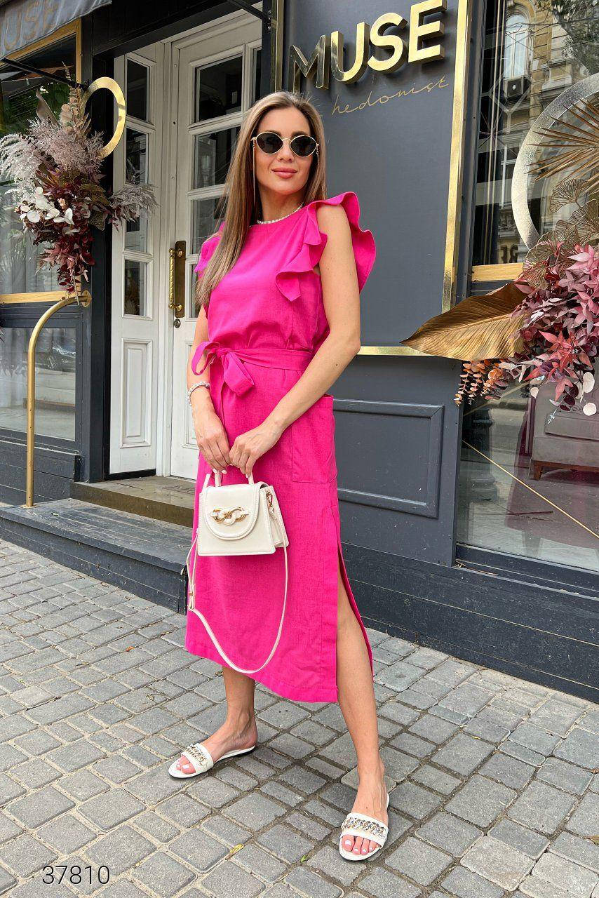 Женское малиновое летнее платье льняное с разрезом и поясом