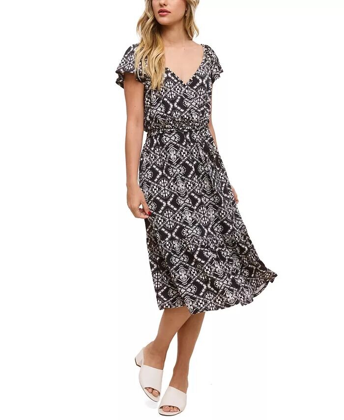 Платье с принтом, рукавами с рюшами, запахом и завязкой.
