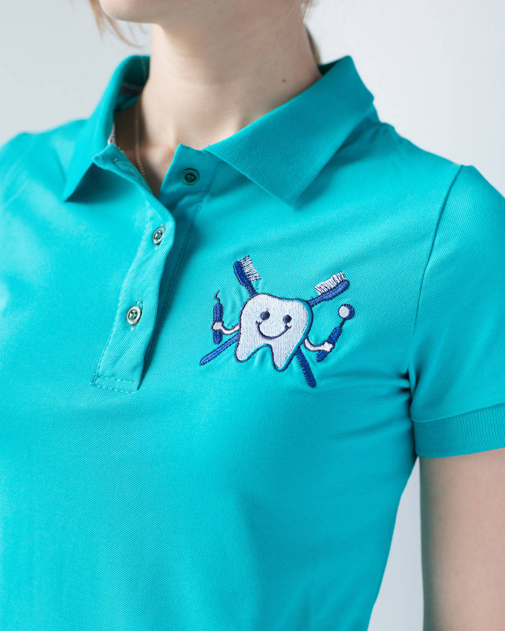 Женское медицинское поло в мятном цвете. Слева на груди вышивка "Зубик". Имеет застёжку на пуговицах со стояче-отложным воротником. Рукав короткий.