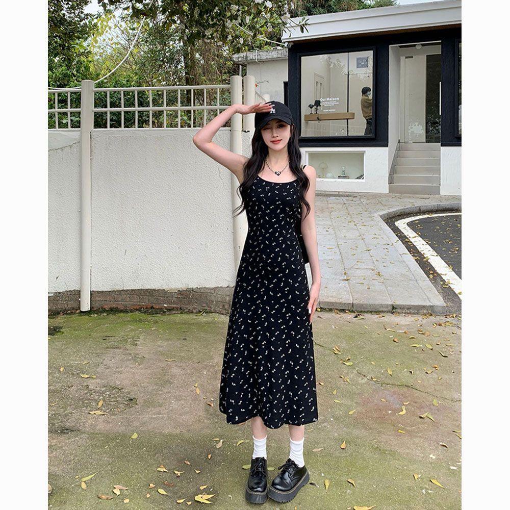 Женское миниатюрное французское черное платье в цветочек на тонких бретельках - Летнее 2024 года Приталенное короткое платье XXL (60-75 kg)