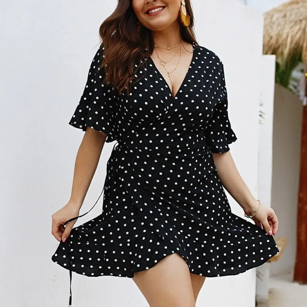 Женское мини-платье в горошек, с глубоким V-образным вырезом и коротким рукавом