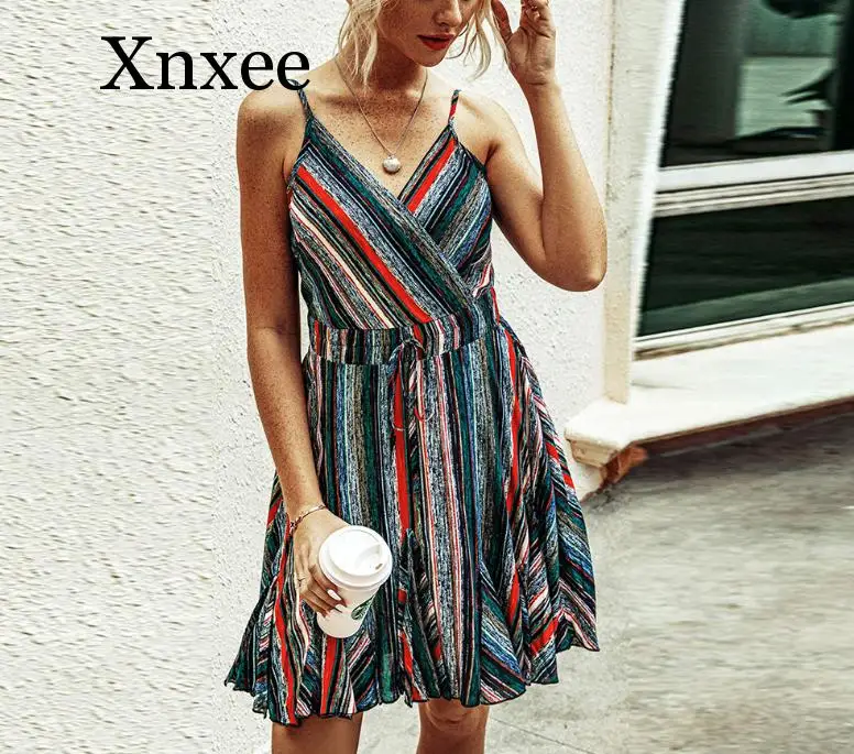 Женское мини-платье в полоску, с открытой спиной и V-образным вырезом