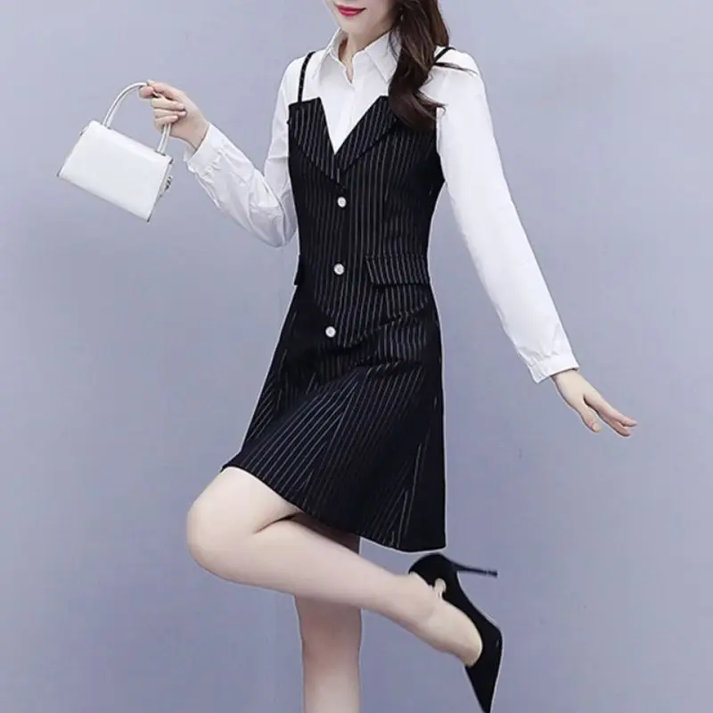 Женское мини-платье с длинным рукавом, элегантное платье-рубашка в полоску в Корейском стиле для офиса и весны и осени, новинка 2023, черная одежда