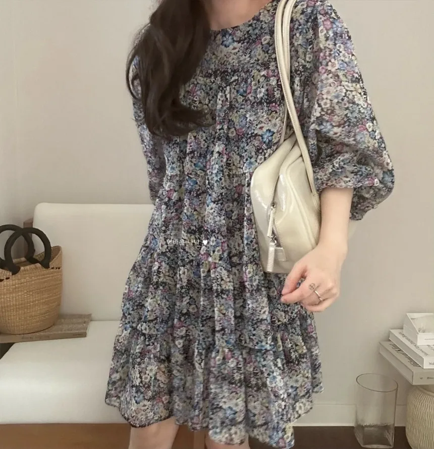 Женское мини-платье с круглым вырезом, длинным рукавом и оборками