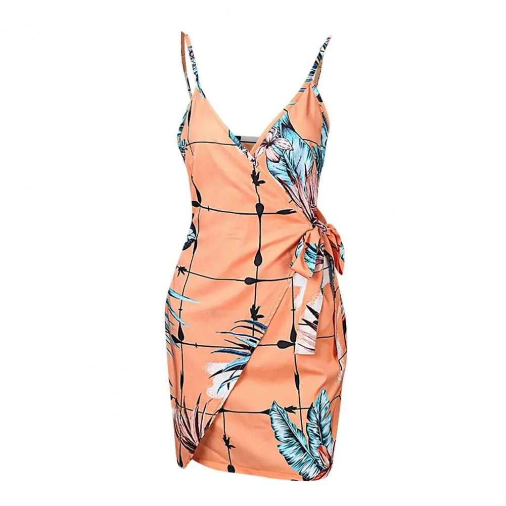 Женское мини-платье с цветочным принтом, V-образным вырезом и открытой спиной