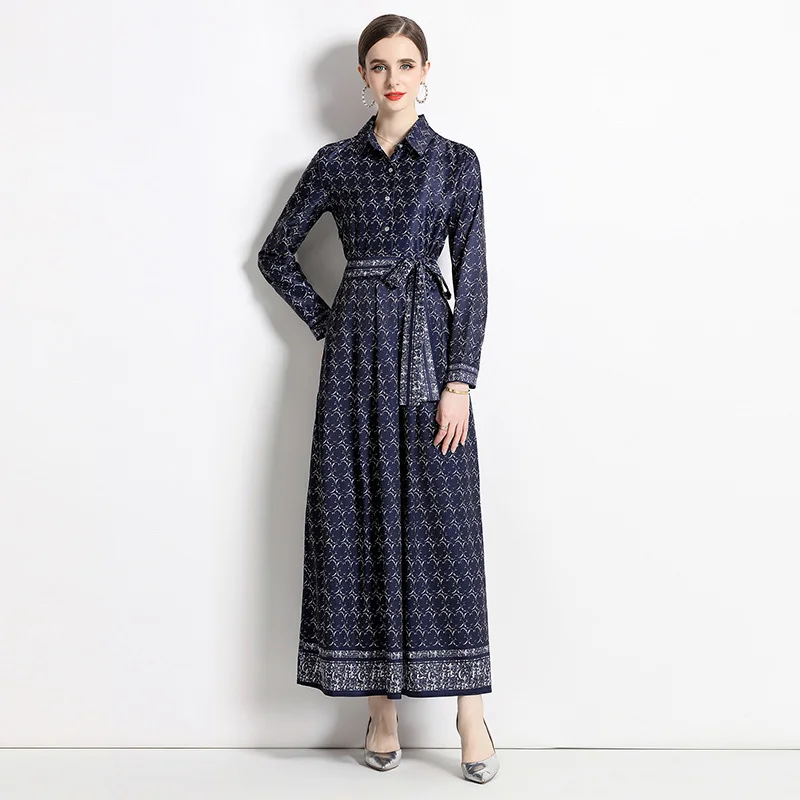 Женское модельное платье-рубашка макси с буквенным принтом, однобортное винтажное платье на завязках с бантом на поясе и длинным рукавом, осень 2023