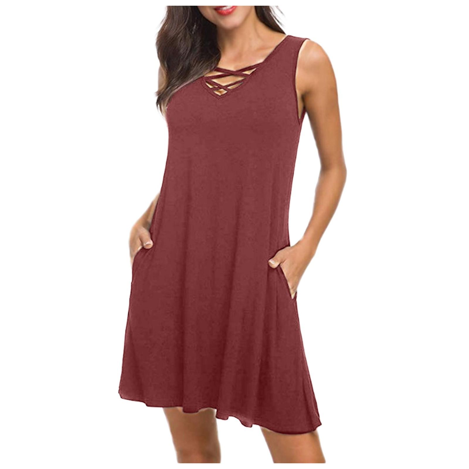 Женское модное летнее платье без рукавов с v-образным вырезом, крестиком и поясом XL винный