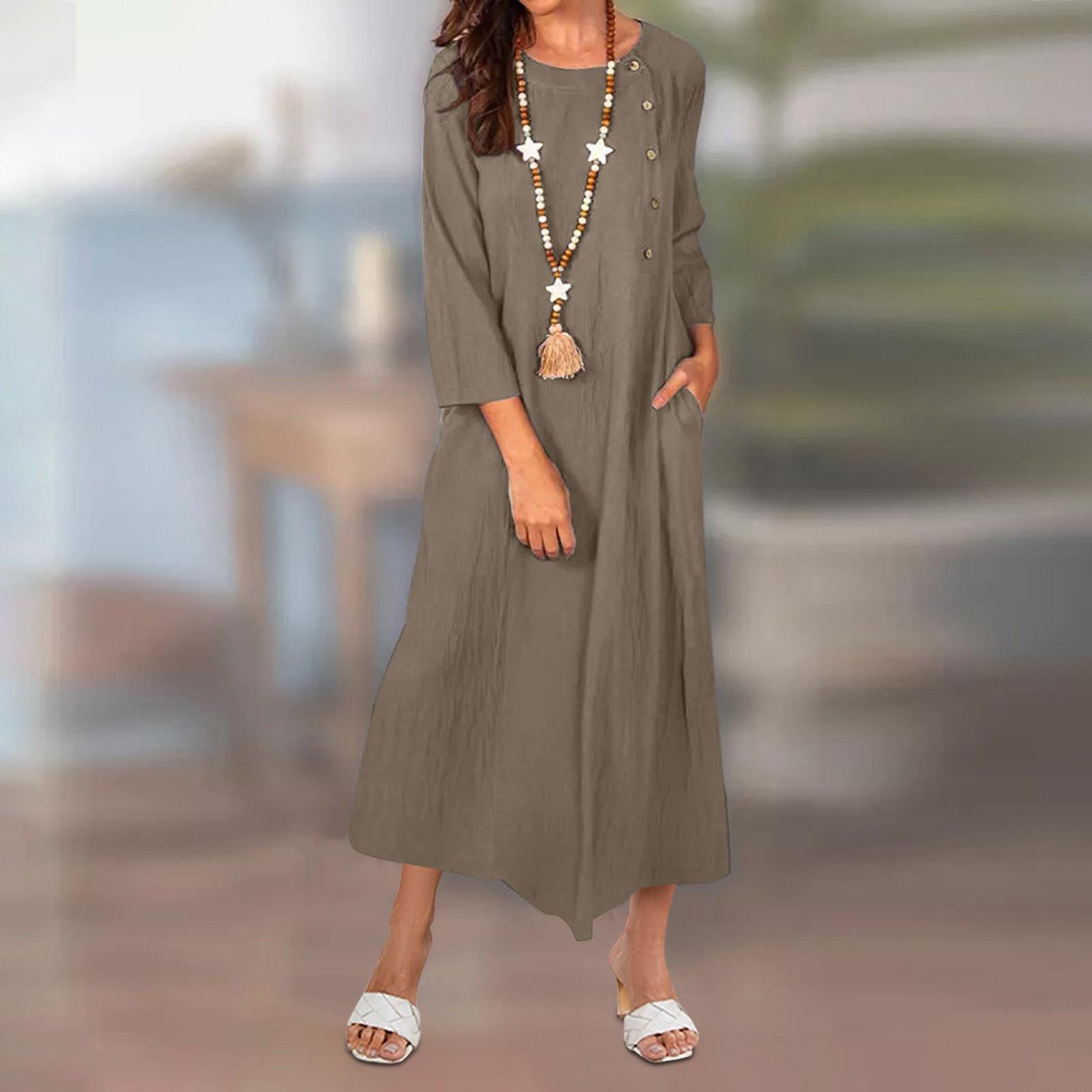 Женское модное однотонное винтажное хлопково-льняное длинное платье с круглым вырезом и карманами на пуговицах и длинными рукавами XL хаки
