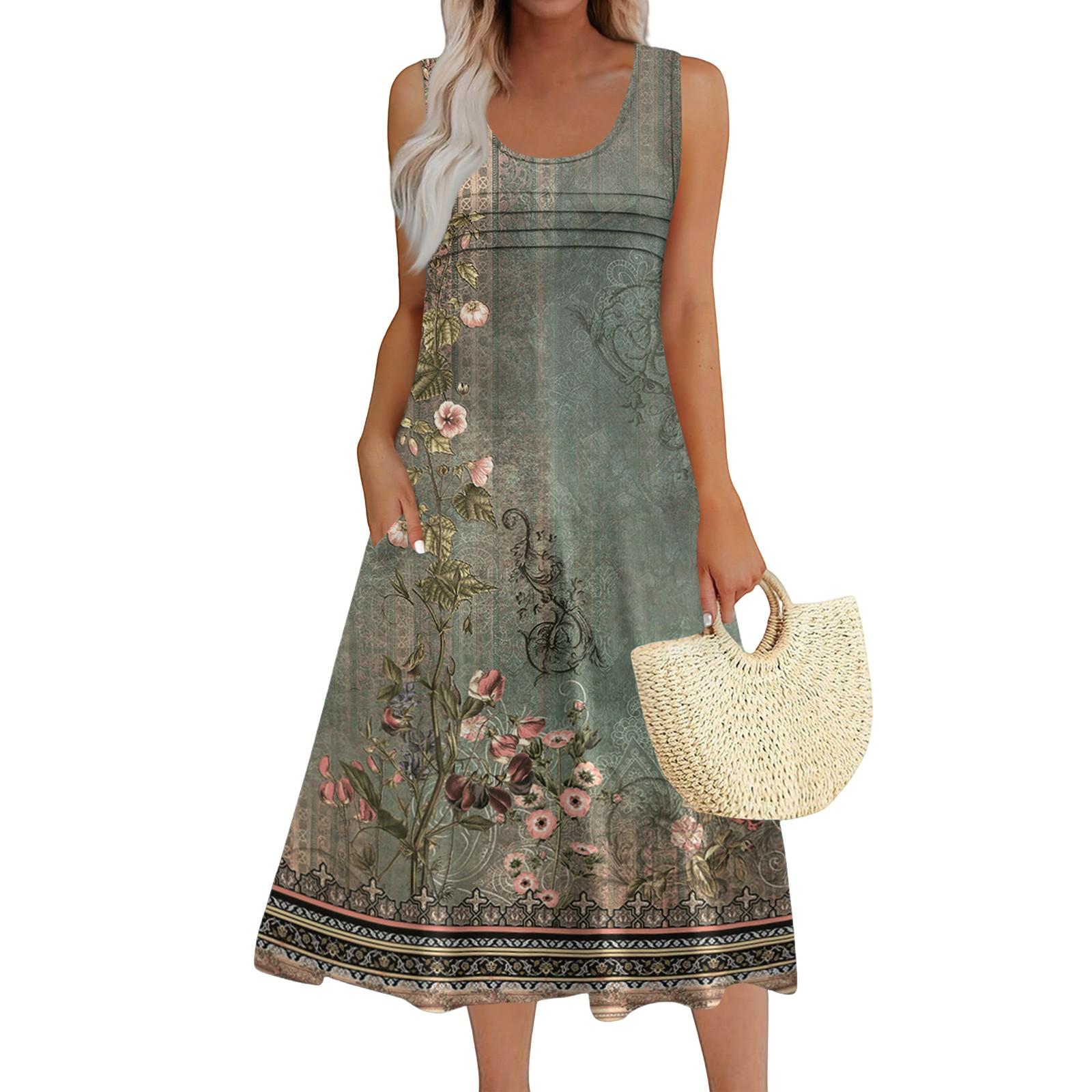Женское модное пляжное платье без рукавов с круглым вырезом и карманами, длинные цветочные платья XXL