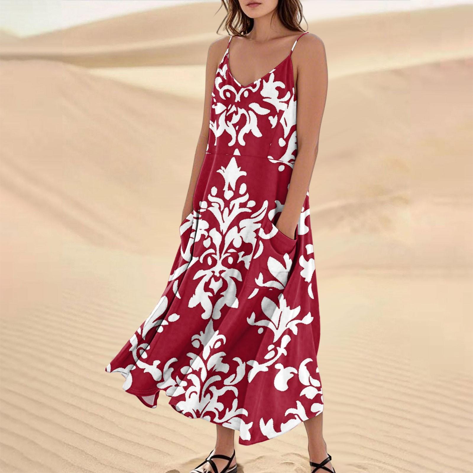 Женское модное повседневное длинное пляжное платье без рукавов с карманом и цветочным принтом S красный