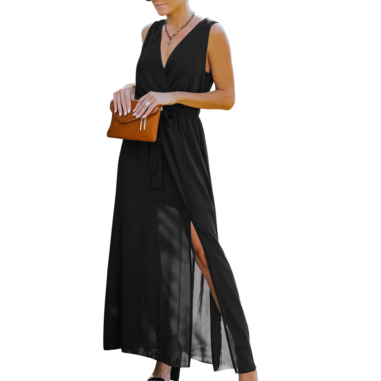 Женское модное повседневное однотонное платье средней длины без рукавов с v-образным вырезом и поясом L чёрный