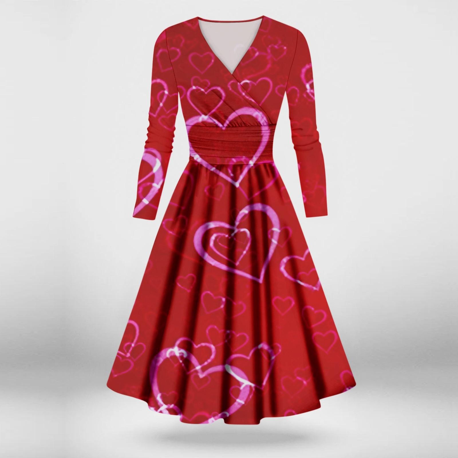 Женское модное повседневное платье с принтом ко Дню святого Валентина, длинными рукавами и V-образным вырезом, сексуальное платье L горячий розовый