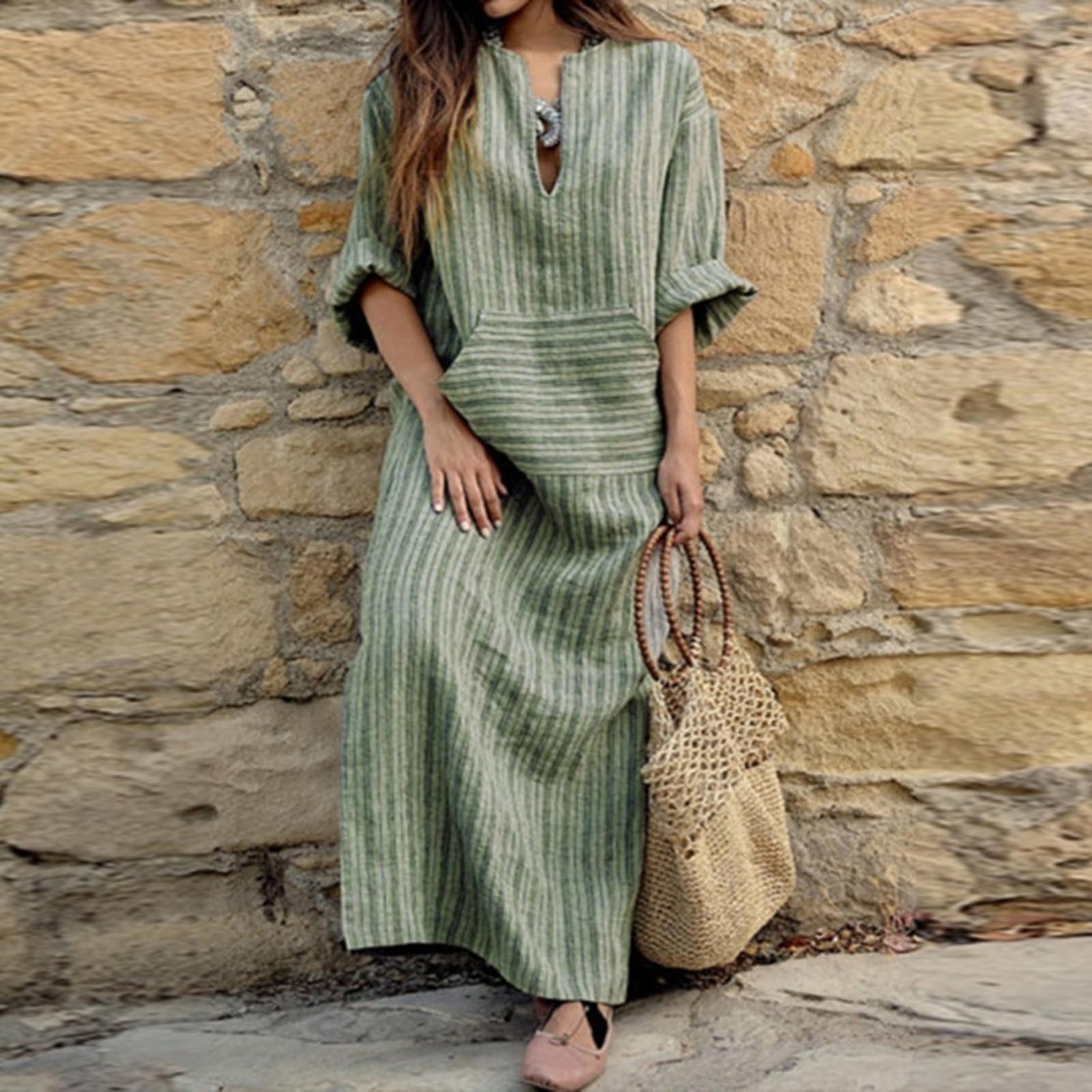 Женское модное повседневное темпераментное длинное платье с v-образным вырезом на весну и лето, новое женское свободное длинное платье из хлопка и конопли большого размера с карманами L зелёный