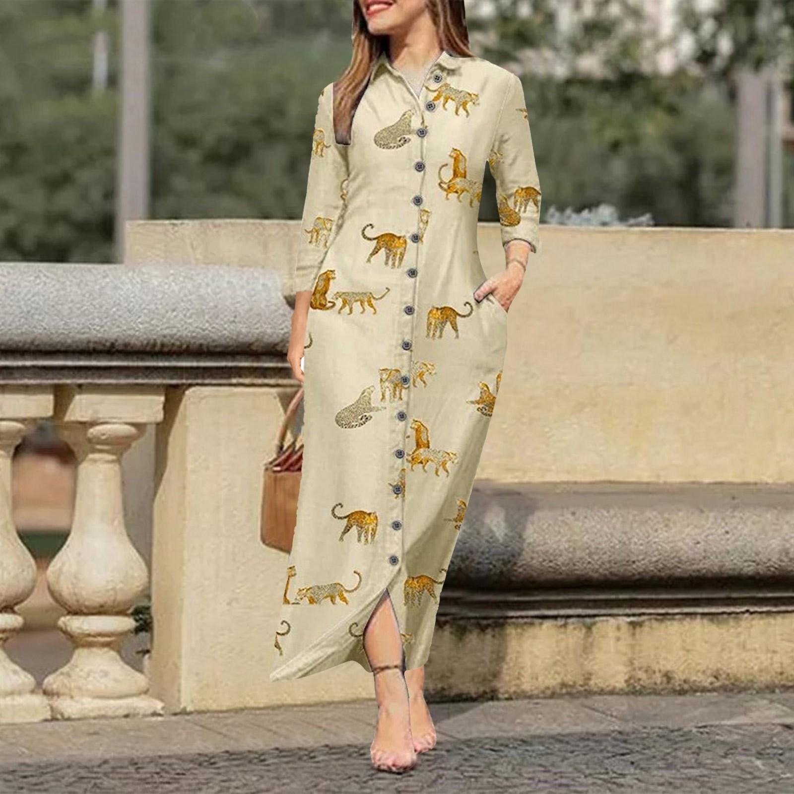 Женское модное повседневное темпераментное свободное платье с длинными рукавами и геометрическим принтом на цепочке, рубашка на пуговицах, длинное платье XL жёлтый