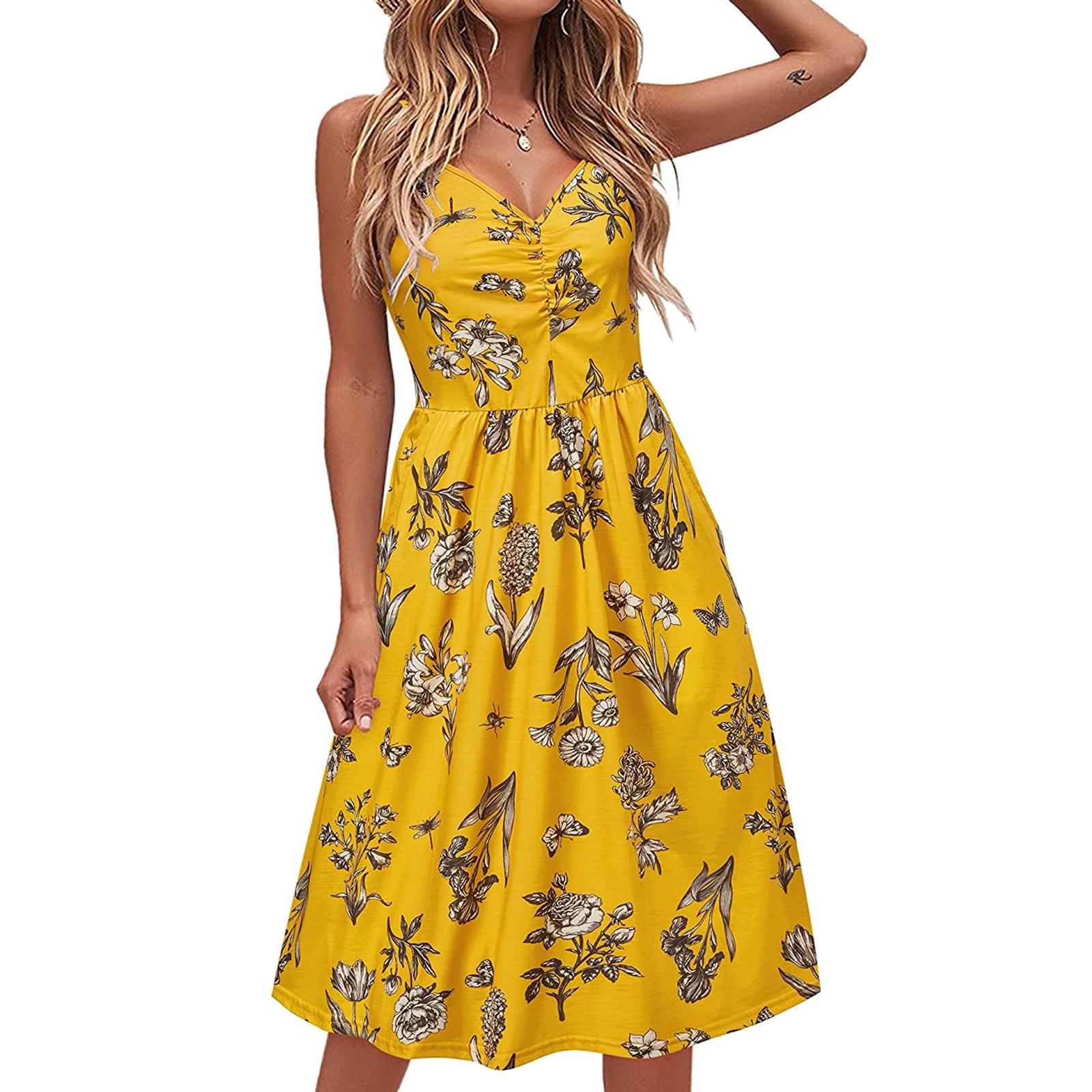 Женское модное повседневное тонкое сексуальное платье средней длины без рукавов с v-образным вырезом и принтом S жёлтый