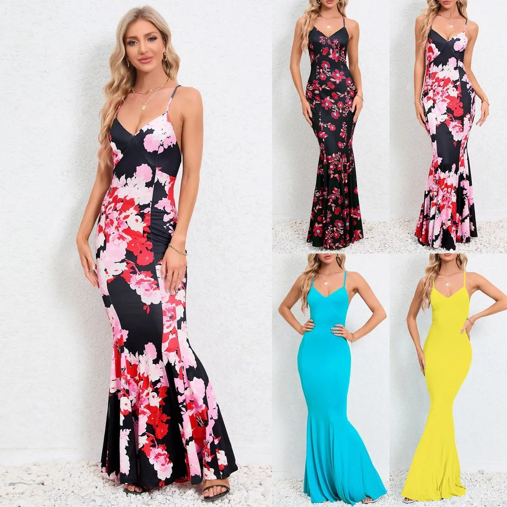 Женское модное повседневное элегантное длинное платье макси без рукавов с подтяжками и цветочным принтом