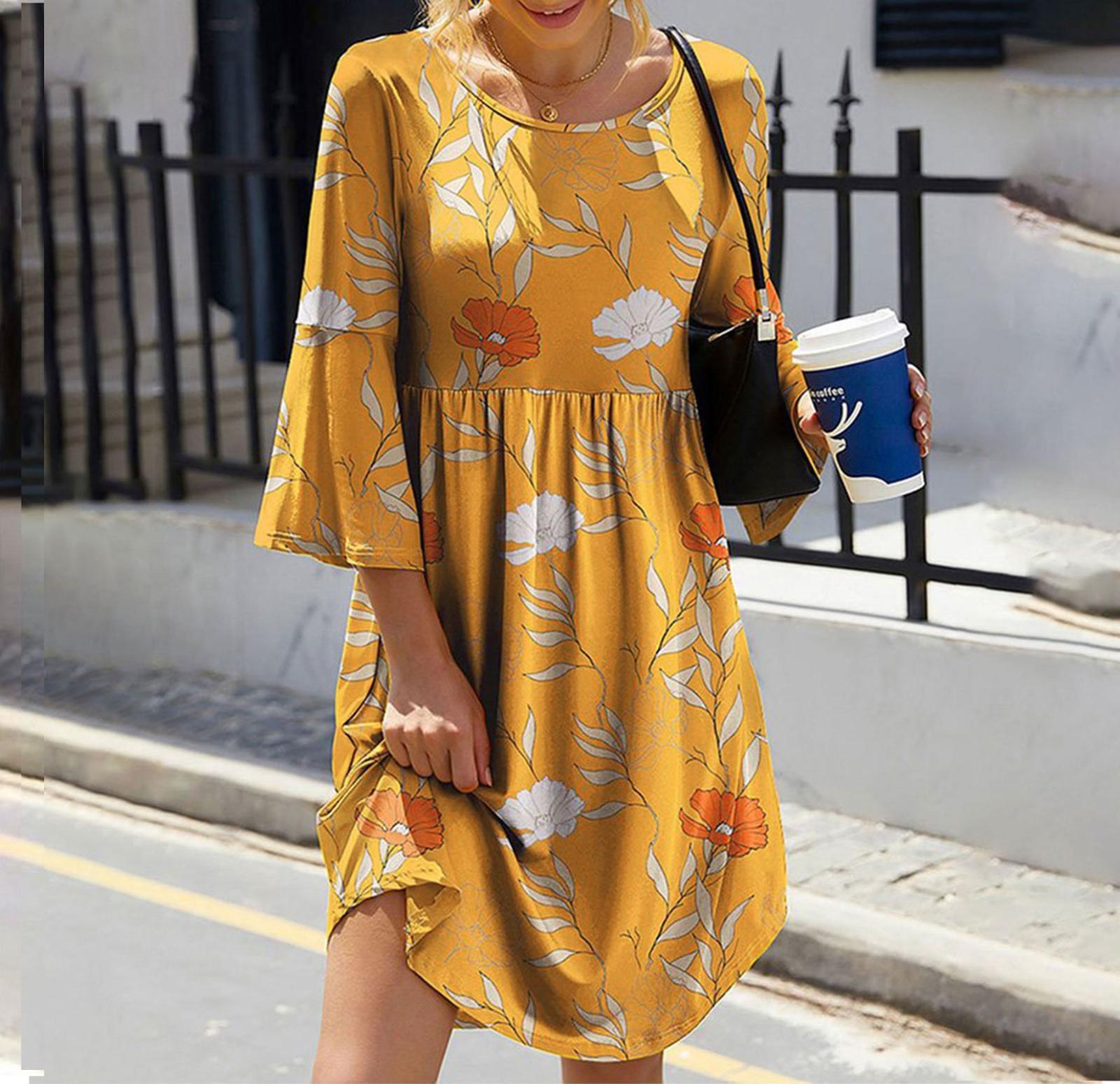 Женское модное повседневное элегантное платье средней длины с цветочным принтом и рукавом три четверти L жёлтый