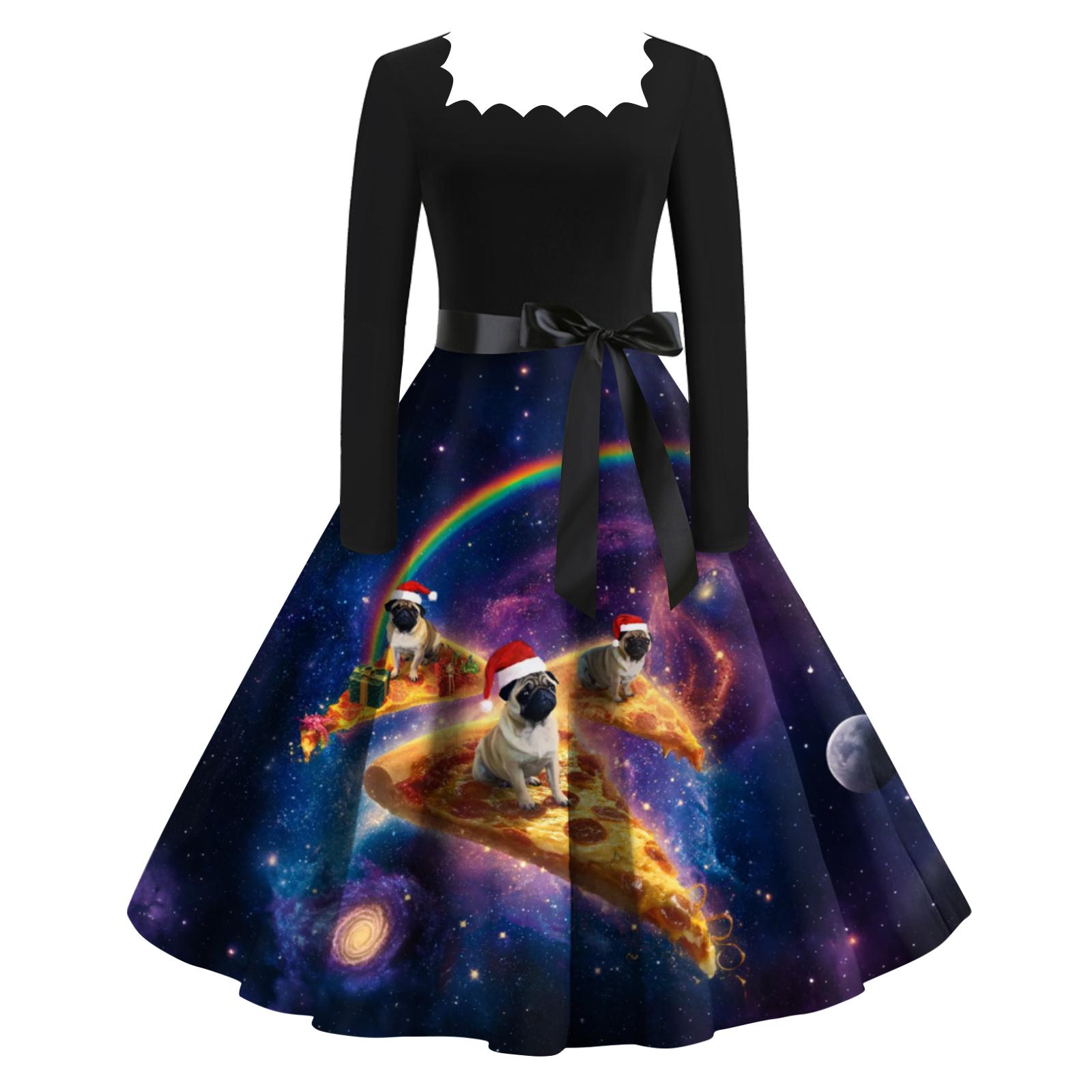 Женское модное ретро вечернее платье с длинным рукавом, квадратным вырезом и рождественским принтом L