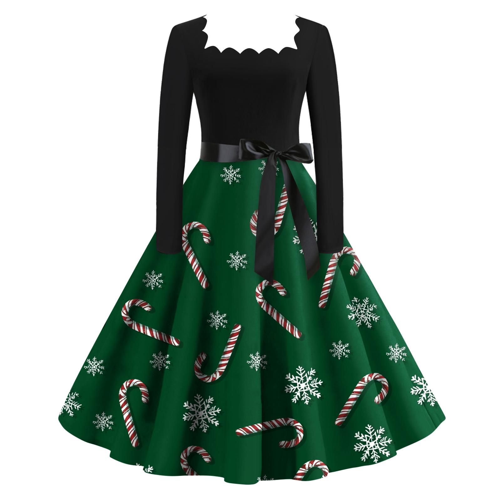 Женское модное ретро вечернее платье с длинным рукавом, квадратным вырезом и рождественским принтом S зелёный