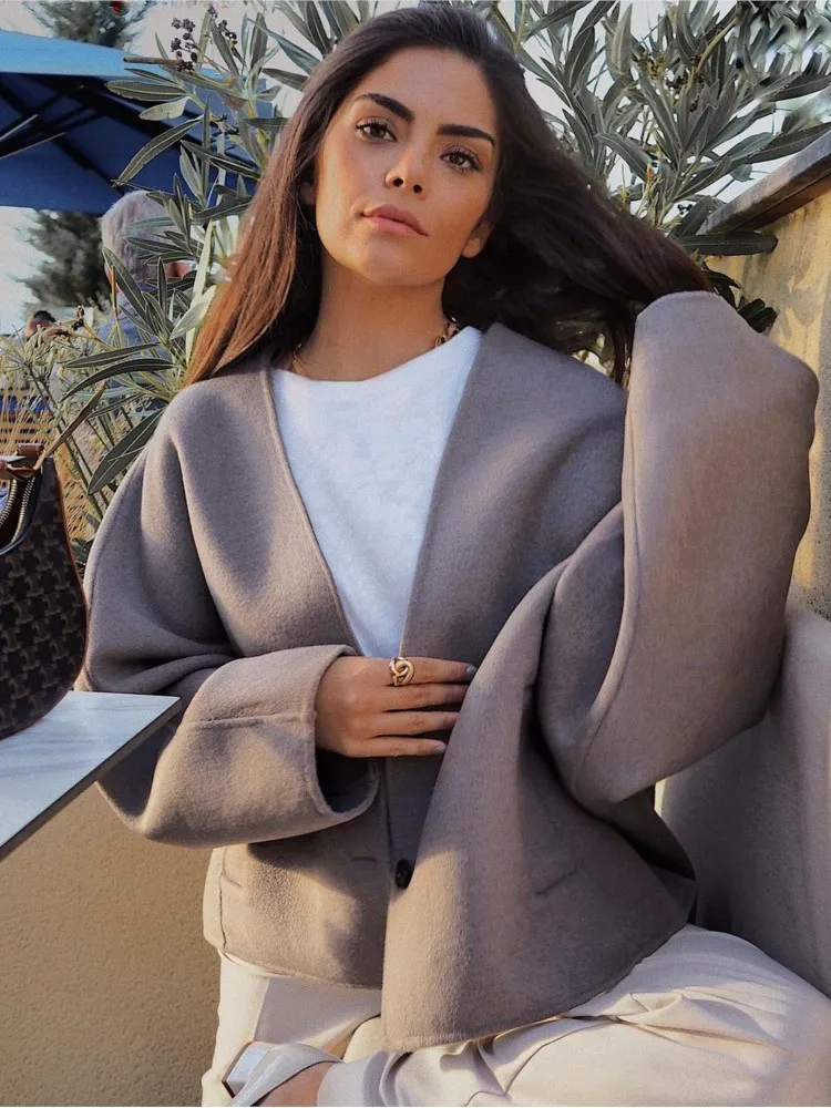 Женское модное серое пальто с V-образным вырезом и открытым стежком, повседневные свободные укороченные куртки с длинным рукавом, осень 2023, женская уличная верхняя одежда