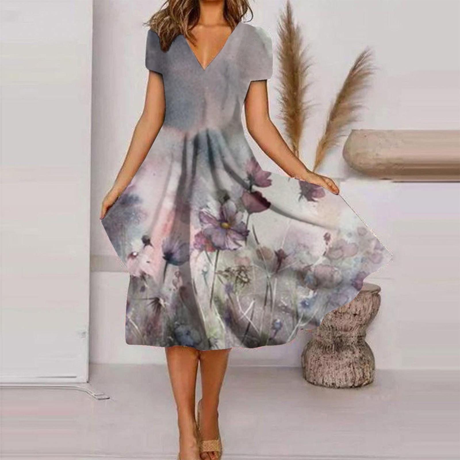 Женское модное и универсальное летнее темпераментное платье с v-образным вырезом и короткими рукавами с принтом XL светло-фиолетовый