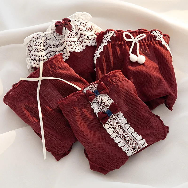 Женское нижнее белье L-XL, трусики, сексуальные кружевные трусики, трусики для девушек с бантом, бордовые, красные трусики, бесшовные трусики с средней талией, женское белье