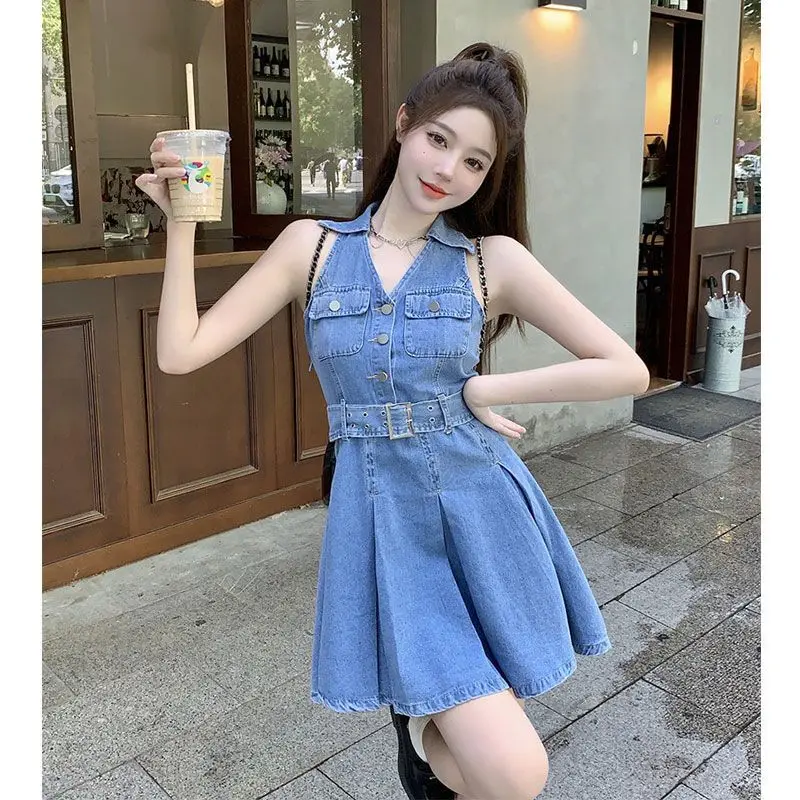 Женское облегающее джинсовое платье, повседневное короткое платье без рукавов, элегантное однотонное платье мини на бретелях, модель M166 на лето, 2023